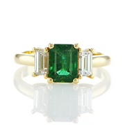 Smaragdens dybde og intensitet kommer til sin ret i dette design, hvor den grønne sten er omkranset af to hvide diamanter i samme slib.