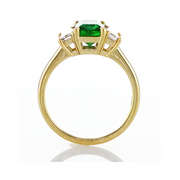 Denne tre-stens ring er påsat en smuk smaragd samt to hvide diamanter. Smykket er af 14 karat guld og leveres med en dyb grøn Smaragd og med hvide og eye-clean diamanter, som er fulde af liv og brillans. Det er muligt at vælge flere forskellige størrelser sten.