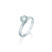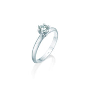 De 6 grabber smelter smukt sammen med selve ringskinnen, som er rund og giver et blødt udtryk. Ringen er elegant og betagende, uanset om den er fattet med en mindre eller større diamant. Det er muligt at bestille ringen i to forskellige kvaliteter af diamanten. Begge kvaliteter er hvide, eye-clean og med excellent cut.